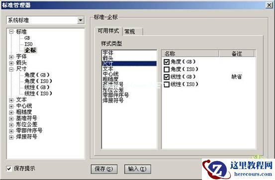 由于“企标”生成时是“ >GB ”的副本,因此这两个标准中的样式都相同。“点( >GB )”、“基准( >GB )”、“箭头( >GB )”、“无” >4 个样式既属于“ >GB ”又属于“企标”(观察仔细的话我们可以发现其实“无”这个样式还属于“ >ISO ”)。根据需要将不符合“企标”的样式选出或选入合适的其他样式(点击“企标”→在显示区的可用样式中选择箭头→点击样式名称前面的选框)。