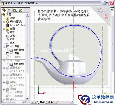 1,轮廓线尽量采用样条曲线,因为这对于后期生成的面有很大的影响,在绘制样条曲线的时候,尽量减少控制点,控制点越多,曲线的曲率变化就越厉害