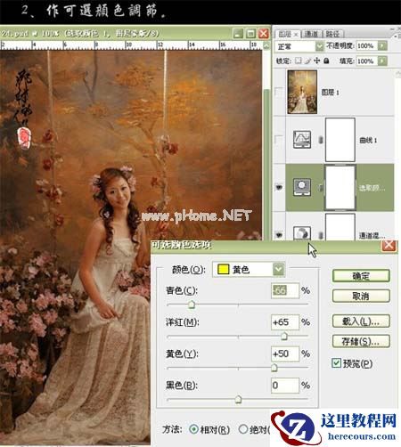 2、创建可选颜色调整图层,对黄色进行调整,参数设置如下图。