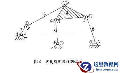 杆组分解结果:型转化数为1;虚拟单构件为BC杆,约束单构件为EG杆,其余两杆为双杆组.