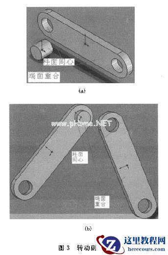 SolidWorks中的配合是基于特征的,而机构中各构件是通过运动副连接的,因此,装配时构件之间的配合特征要体现出运动副的类塑特性.图3说明了转动副的定义过程.