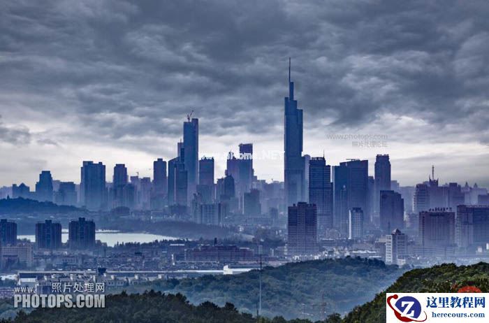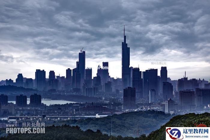 8、调整云彩的曝光度,突出主体——城市建筑。