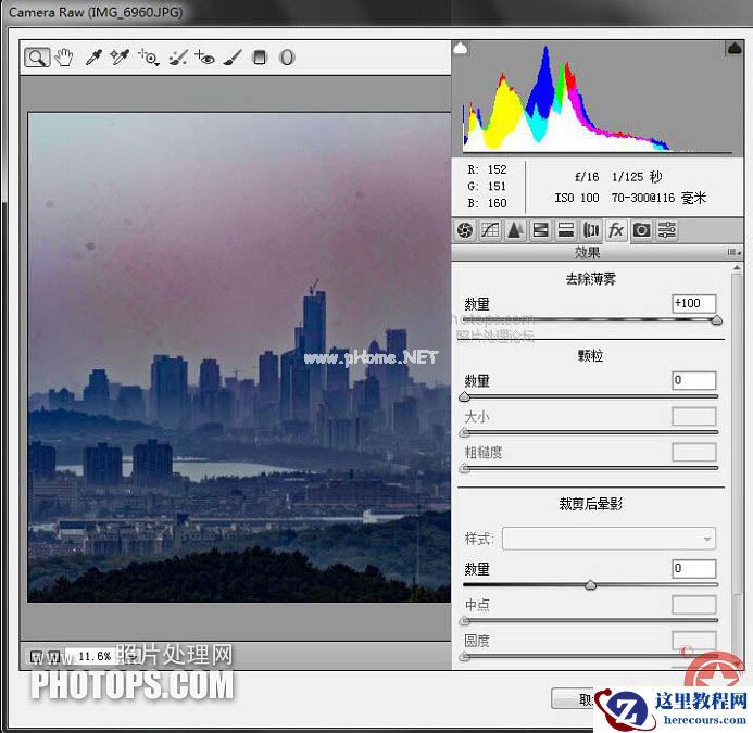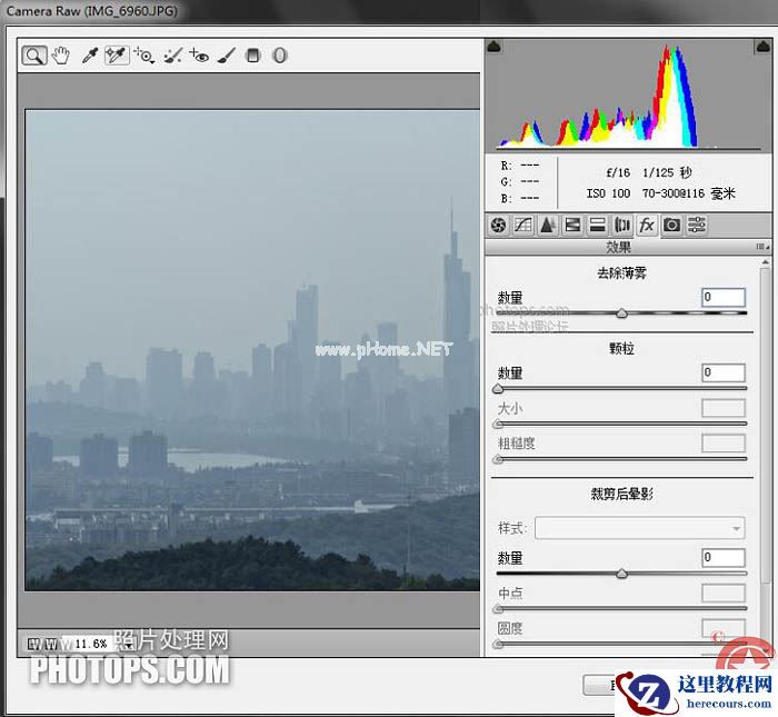 1、打开图层后先复制背景图层,CTRL+J键,然后进入滤镜ACR程序,去雾霾程序显示为0。