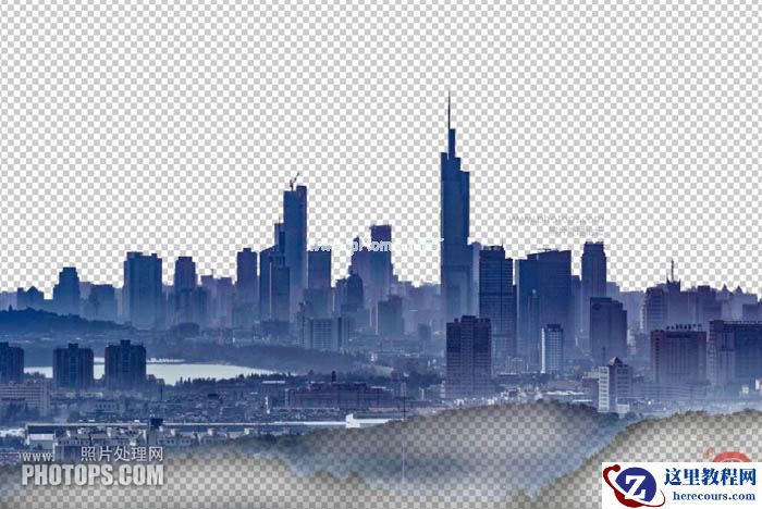 7、把云彩的图片放在城市建筑的下一层,就是建筑的后面,把底边部分删除。