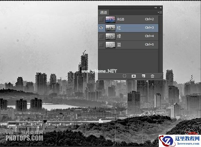 3、确定后选择红色通道,用魔棒对着天空选区,半径模糊1。