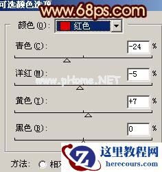 3、创建可选颜色调整图层,对红色进行调整,参数设置如图