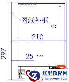 我使用的图纸格式如下图,请注意一定要绘制图纸的外框!也就是图中的297x210(A4)的矩形,也可以在对角线上绘制两个短线)