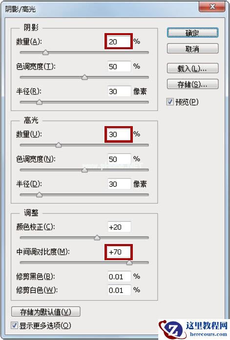 选择“图像-调整-阴影/高光”命令,在弹出的对话框中将“显示更多选项”勾选,设置各选项的参数。