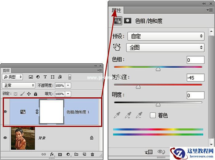 在“图层”面板底部单击“创建新的填充或调整图层”按钮,在弹出的菜单中选择“色相/饱和度”命令,得到“色相/饱和度1”图层,在弹出的面板中进行设置度。