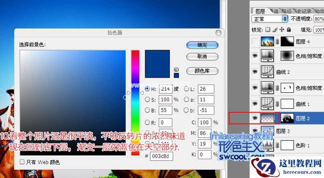 10、看整个照片还是很平淡,主要是天空部分蓝色还不够蓝。在刚才盖印的图层上面新建一个图层,选择渐变工具,颜色设置为蓝色至透明渐变。然后由上至下拉出渐变,图层不透明度改为:80%,效果如下图。