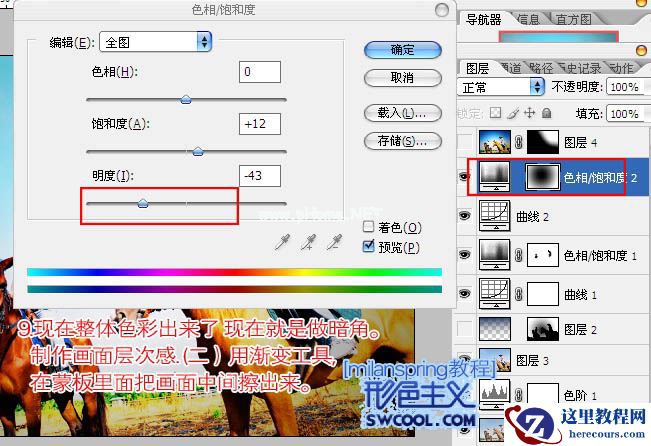 9、现在整体色彩出来了,剩下的就是做暗角。做出画面层次感。创建色相/饱和度调整图层,对全图进行调整,适当降低明度的数值,参数设置如下图。确定后用黑色画笔把中间部分擦出来,如下图。