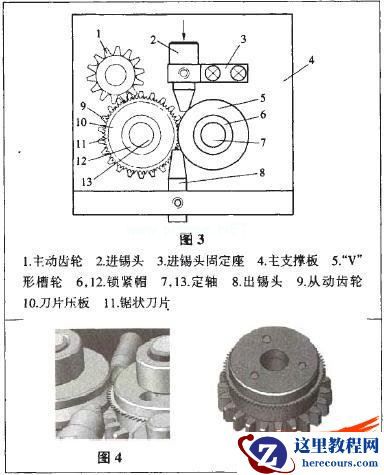 当焊锡丝由进锡头插入(箭头所指方向)到齿轮刀片组件和"V"形槽轮之间时,由电机主动齿轮带动装在定轴上的齿轮锯状刀片组件转动,此时锯状刀片刀尖扎入到焊锡丝里面。由于在"V"形槽轮的定位作用下,同时带动焊锡丝向前移动,并经出锡头将打好孔的焊锡丝送出。