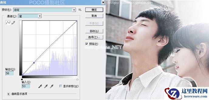 4、新建一个图层,盖印图层得到新图层,为了增加人物的红润效果,建立曲线调增层,参数如图。人物部分需要用不透明度低一些的画笔来擦拭图层蒙版。可见最后截图: