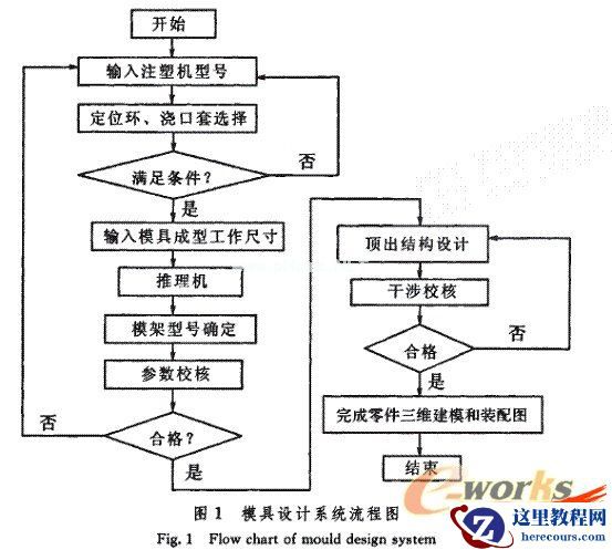 在传统的模具设计过程中,用户首先对塑件进行分析和选材,计算得出模具成型工作尺寸,然后通过复杂的公式计算和查找相关手册来选择标准模架的型号,并设计出合理的浇注系统和顶出系统,最终按照以上的设计结果绘制出该塑件模具的装配图和工程图。然而在设计过程中几乎每一个流程都需要经过大量的数据查询和计算,而且大部分流程中都是依赖于设计者的经验进行设计,因此很难避免在模具设计过程中人为因素所造成的失误。为了解决这些问题,笔者深人研究了注塑模具设计的原理和特点,设计出一种基于SolidWorks的注塑模具的CAD系统,即在用户得到塑件成型工作尺寸后,由用户输人注塑机信息和成型工作尺寸信息后,系统通过规则库的规则从模架库里找到最符合规则前提的模架.并通过人工辅助的方式进行顶出系统的设计,然后通过SolidWorks API驱动程序进行模具的三维建模。它主要由注塑机选择模块、模架型号选择模块和人工辅助模块组成。流程如图1所示。