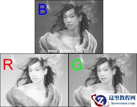 步骤二、打开通道面板,通过R、G、B三个通道的对比发现, B通道是对比最强烈的,但比较脏,不如G通道来得干净,所以我选择G通道作为可利用通道。