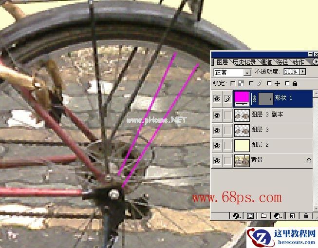 3.画钢线时,细心,加上用自己对单车的了解,感觉出大概,反正我们的目的只是让它抠出来后很逼真就形了.(这里为了突出,线条的颜色我用了比较鲜艳的颜色),描的直线如图4所示。完成的效果如图5