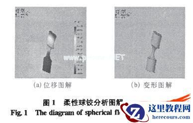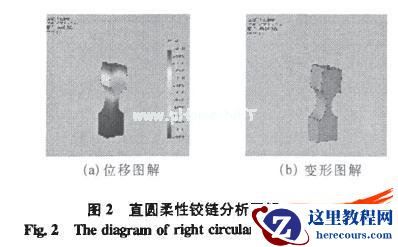 柔性铰链的结构有很多种形式,最常用也是最基本的形式是绕一个轴弹性弯曲,即单轴柔性铰链.初选两种单轴柔性铰链--柔性球铰(圆形截面铰链)和直圆柔性铰链(矩形截面铰链).通过有限元分析软件COSMOSXpress,分析材料为铝合金,最小厚度t和切割半径r的尺寸为t=2 mm,r=3 mm的两种不同截面铰链在最大受力下的位移和变形情况,如图l和2所示.