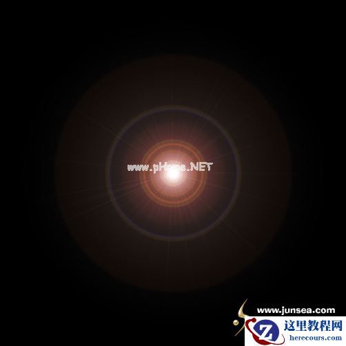2.执行菜单-滤镜-渲染-镜头光晕,亮度为100,竟头类型选50-300毫米变焦,将光晕中心移至图象中心(图1)。