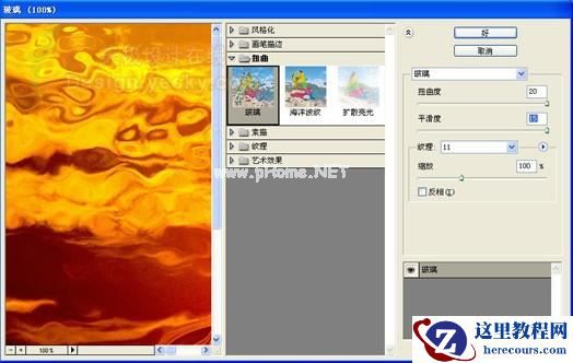 7、选择图层2,执行菜单栏中的“滤镜”“扭曲”“玻璃”命令,弹出玻璃对话框,在对话框中将扭曲度和平滑度调至最大,纹理选择载入纹理,选择载入纹理后弹出一个打开的对话框,选择刚才保存的PSD文件,设置如图06所示。