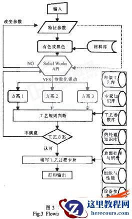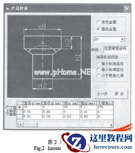 下面以一端粗大的轴类件为例,介绍以VB为开发平台,利用SolidWorks建立此类件的工艺分析的常用方法。如图1所示。该类型是典型的正挤压件,成形方案如表1所示。首先将零件的尺寸数据输入数据库,然后根据材料种类调用材料库,按照毛坯直径选择成形方案.利用VB通过调用SolidWorks的API函数绘制零件的模型。再调用零件尺寸数据对模型进行参数化驱动并显示零件质量特性。根据体积不变原则.可以求出毛坯尺寸特征.再通过工艺规则判断如果满意就填写工艺过程卡片,否则,改变工艺方案或改变零件尺寸参数。程序的运行交互界面如图2所示。图3为程序流程图。
