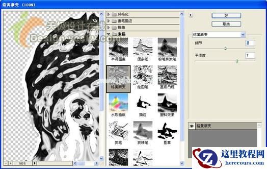 5、选中图层1副本,选择菜单栏中的“滤镜”“素描”“铭黄”命令,在弹出的“铭黄渐变”对话框中设置细节为5,平滑度为7,如图06所示。