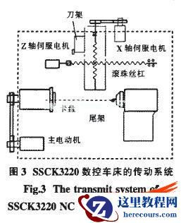 虚拟数控机床建模关键技术是零件的三维造型、虚拟装配和动态仿真。虚拟机床的几何建模包括:虚拟床身,床头箱,主轴,刀架,尾座,工装夹具等。机床的几何模型涉及机床的几何参数、运动关系、伺服系统、刚度和热影响等。此处以SSCK3220型数控车床为原型进行几何建模。首先分析SSCK3220型数控车床的结构,图3给出该机床的传动系统结构示意图。