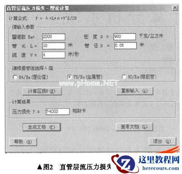 选择系统菜单,弹出"直管层流压力损失计算"窗口(如图2所示),添人各选项的数据,点击"计算压损",显示出所计算出的数据。图中,λ为沿程阻力系数,它的理论值为λ= 64/Re,而实际由于各种因素的影响,对光滑金属管取λ=75 / Re,对橡胶管取A=80/Re。