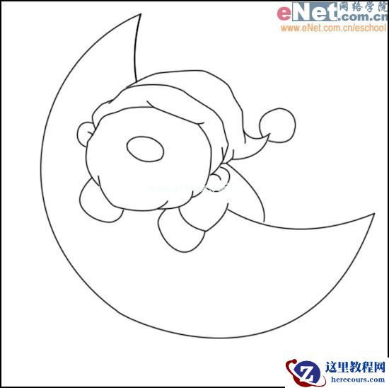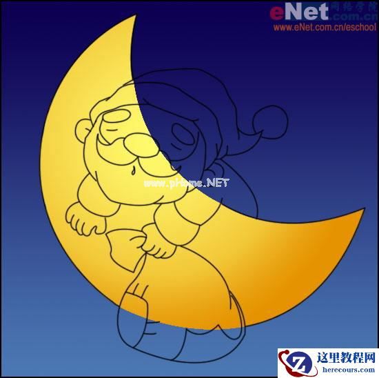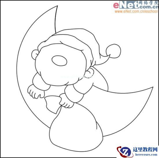 2、根据前面的轮廓线用钢笔勾出月亮与圣诞老人的主要外形,擦除月亮被遮挡的部分。