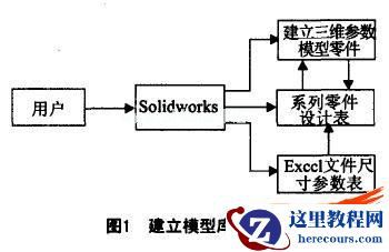 考虑到设计中常常需要用到大量标准件,而利用Solidworks的系列零件设计功能建立三维模型库,设计人员便可利用该库功能,将结构大体相同而尺寸不同的零件建立为一个基本形体零件,之后通过建立系列零件设计表而生成结构相同的系列零件,由此,在Solidworks环境下建立了教学常用的模型库。在工程制图的教学中,当相贯体的两相贯尺寸或位置发生变化时,相贯体的形式将发生变化;截切平面位置发生变化时,截切体也发生变化,此时便可运用系列零件设计的方法,给出相贯或截切的系列零件表来改变其几何形体。Solidworks环境下的三维模型库系统建库流程如图1所示。通过Solidwork,建立某种立体的默认图形,将模型的对应参数几何尺寸数据转换为Excel文件,使Excel文件作为"源"文件输人到已建模型的系列零件设计表中,再将所建立的各类模型按一定的目录分门别类地储存在硬盘某路径下,将该路径添加到Solidworks系统选项中添加特征模板浏览器的参考路径中,即可以于模型库中查询和调用各类模型。
