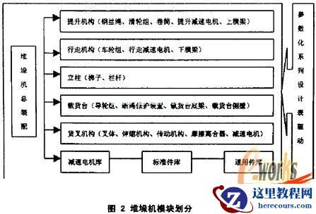 选取双立柱式堆垛机作为实施目标,将堆垛机按照图2分为若干关键模块和支撑库,包括:①提升机构:②行走机构:③立柱:④载货台;⑤货叉机构;⑥电机库;⑦标准件库:⑧通用件库等。以SolidWorks2001作为图形平台,由于该平台具备系列零件设计表的开发功能。