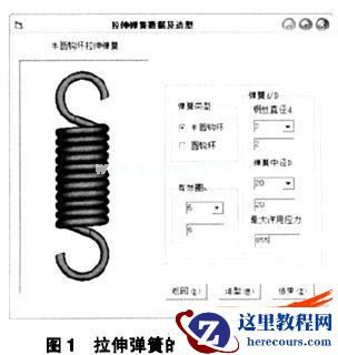 一个良好的操作界面对于一个应用程序来说至关重要,弹簧零件库的界面以窗口模式来实现。采用下拉列表框,让用户从中选取,而不是自己输入,这样保证了用户的信息符合国家标准。同时,界面设计尽可能简单、直观;提供尽可能多的保护措施,使输人信息符合标准。图1为拉伸弹簧建模的界面。