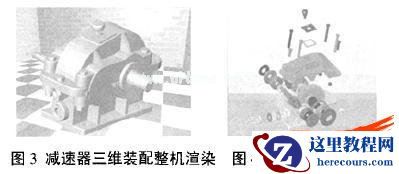 该齿轮减速器的三维装配比较复杂,关键在装配时要明确各个零部件间的位置约束关系,如对齐、重合、平行、相切、同轴等,并注意装配的前后顺序,可将其分为主动轴系零件:主动齿轮轴、滚动轴承、挡油环、调整环、主动轴透盖、主动轴闷盖等;从动轴系零件:从动轴、齿轮、滚动轴承、定位套筒、调整环、从动轴透盖与从动轴闷盖等;箱座及其附件:油标小盖、反光片、油面指示片、螺钉、油塞等;箱盖及其附件:窥视孔盖、通气塞、螺钉、螺母等一一装配,然后再集中安装。图3是该减速器三维装配整机渲染图, SolidWorks装配较为灵活,采用树形方式表达装配体中的层次和约束关系,采用SmartNlate方法,在动态拖动零部件的同时,可自动捕捉适当的配合关系,进行装配,在进行零件间三维装配的同时,可进行零部件之间的干涉检查,计算装配休的各种物理属性。