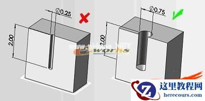 孔深度/直径比率大于 2.75的孔较难加工,不推荐进行批量生产。如果是盲孔,孔越深,清理碎屑越困难。如下图:2/0.25=8 , 2/0.75=2.7