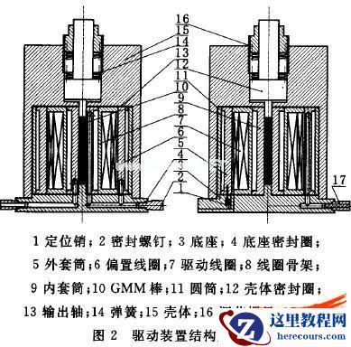 由GMM棒、输出轴、气隙、壳体和底座等组成闭合磁路,此种设计可以尽可能减少漏磁,提高通过GMM棒的磁通量;由调节螺母、弹簧和输出轴对GMM棒施加预压力,此轴向预压力可使GMM棒内部磁畴在零磁场时尽可能地沿着与轴向应力垂直的方向排列;对驱动线圈通电,其产生的外加激励磁场,可使GMM棒获得较大的轴向磁致伸缩应变,从而增大位移和力的输出;偏置线圈通电后对GMM棒施加一定强度的极化磁场,可使GMM棒磁致变形处于线性区域,本装置偏置线圈产生的磁场可通过电流大小调节以适应不同的工况.