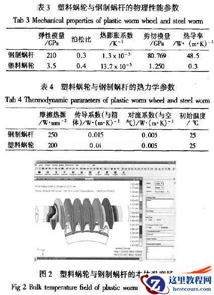 设置蜗轮蜗杆材料属性分别为聚甲醛塑料(POM)和合金钢16MnCr5。网格划分采用于动划分六面体网格,为提高接触面处的精确性,对轮齿啮合部分进行网格细化。节点总数为160 023,单元总数为141 168,节点自由度总数为852 152。蜗轮蜗杆材料物理性能参数和热力学系数(见表3、表4)。