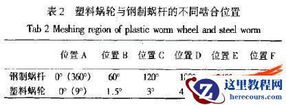 为了完全反应齿轮在周期运动过程中的齿轮啮合情况,必须建立蜗轮蜗杆传动过程中的各个位置模型。随着蜗杆旋转,轮齿上接触区的位置是呈周期性变化的。其周期为9°,塑料蜗轮每旋转9°,则需要蜗杆旋转一周。将蜗轮蜗杆啮合位置分为6个位置(见表2).