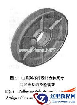 4)视零件的不同特征及不同的设计要求采取不同的驱动方式.图2所示滑轮的绳槽部分,因其参数由起重行业规范规定,故采用系列零件设计表来驱动,通过生成不同的配置来实现模型的改变,因其内孔径、宽度与轴承的配合有关,故在装配体中建立方程式与几何关系约束,通过尺寸驱动来实现.