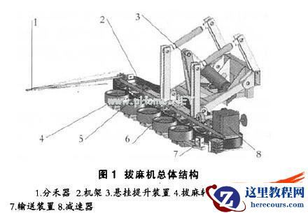 悬挂式拔麻机主要由机架、变速箱、主动轮、拔麻带、压紧轮、输送装置、悬挂提升装置、拔麻装置等组成(图1)