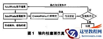 轴向柱塞泵以其压力高、流量大、易于实现变量,为高压力、大排量、需要变量的液压系统中动力元件的首选。分析轴向柱塞泵的各种部件的运动关系,并绘制出其运动曲线对于轴向柱塞泵的理论分析和设计都有着重要意义。COSMOSMotion是一种用于机械系统仿真的计算机软件。它作为SolidWorks的一个插件,可以帮助设计人员利用已经建立的三维模型进行运动仿真。COSMOSMotion是一个全功能运动仿真软件,与当今主流的三维CAD软件SolidWorks无缝集成,可以对复杂机械系统进行完整的运动学和动力学仿真,得到系统中各零部件的运动情况,包括位移、速度、加速度和作用力及反作用力等。并以动画、图形、表格等多种形式输出结果,还可将零部件在复杂运动情况下的复杂载荷情况直接输出到主流有限元分析软件中,从而进行正确的强度和结构分析,其分析结果可指导修改零件的结构设计或调整零件的材料。轴向柱塞泵的运动仿真步骤如图1。