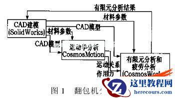 图 1 表明,用 SolidWorks 建立回转架的几何模型,在 CosmosMotion 中建立运动关系并施加作用力进行运动仿真,得到其构件的受力,这些力将作为 CosmosWorks 中进行有限元分析和疲劳分析的载荷与约束条件,最终的分析结果作为改进结构设计的理论依据。