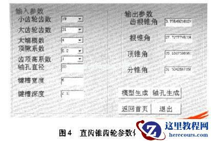 然后在相应的位置建立对应的单个齿形(或齿间),正是当量齿轮的齿形(或齿间)。恰当地利用软件基准平面建立中过曲面上的一点建立已知曲面切平面的功能,由软件的性质可知:背平面的坐标原点就是原曲面的那一点。有了上述理论就可在平面上绘制一个齿间草图然后把草图向锥点圆放样切除切出一个齿间。再阵列放样特征得到锥齿轮的全部齿形。(过程如图3所示)在背锥切平面内当量齿轮的中心即背锥顶点。如图3的01, 01和背锥切平面的新原点的距离为l = xc/cos (δl)如图3所示齿间的草图是由关于坐标系对称的渐开线和径向线及圆弧组成,只是模数用大端模数,齿数用当量齿数。最后把放样的齿间阵列得到锥齿轮的实体模型。参数化的程序界面如下图4所示。将生成的锥齿轮模型应用COSMOS/ Works进行有限元分析。