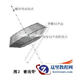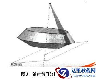 直齿圆锥齿轮造型的基本思路是先画出锥体,然后创建背锥切平面并在该平面上画出一个当量齿形,用此当量齿形向锥顶放样切除,最后把放样特征阵列,得到完整的锥齿轮。由图1加上必要的约束尺寸经过计算可知A,B,C,D,E,F点的坐标,画出ABCDEF多边形以Y轴为旋转轴旋转一周可画出锥齿轮的锥体。其中图1中R为锥距,m为模数,δl为分锥角、δa为顶锥角、δf为根锥角、b为齿宽b=R/3,如果给定锥齿轮的大端模数。、配对锥齿轮的齿数z1.z2多边形ABCDEF很容易绘制。由图1可知BC直线绕Y轴旋转得到锥面,这一圆锥称为背锥;由于锥齿轮的渐开线为球面渐开线故无法展开。为了研究方便可以用圆锥齿轮的当量齿轮,它的模数和压力角与锥齿轮的大端的模数和压力角是一致的,但是这一理论只是为了研究锥齿轮的正确啮合和重合度等间题。因为计算机无法完成上述操作,作者采用等效思想将背锥面的展开用背锥上建立切平面来代替。(如图2所示)