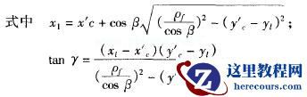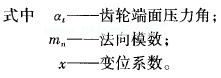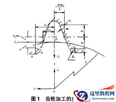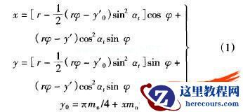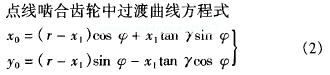 点线啮合齿轮其小齿轮是渐开线变位的特殊短齿,大齿轮为具有部分渐开线和过渡曲线的凹齿廓。如图1所示,xoy坐标系是固定在齿轮坯卜的静坐标系,坐标系原点。在齿轮坯的中心;x1py1坐标系是固定在齿条刀具上的动坐标系,其原点P的起始位置取在齿轮轮齿对称轴线与分度圆的交点P处。根据齿轮啮合原理,当用齿条形刀具加工时,动坐标x1dy1的坐标轴py1沿被加工齿轮分度圆半径:作纯滚动,齿条刀具在齿轮坏上形成的包络线就是齿轮的齿廓曲线。因此可推导出被切齿轮的齿廓曲线方程,其中齿轮齿廓渐开线部分方程式为: