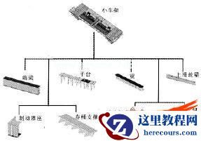 基于以上原则本系统把小车架划分成了主梁,端梁,平台,减速机座,卷桶底座,制动器底座,支腿及附属板等几个功能模块其中主梁和端梁作为主要模块,将决定着小车架的主要形状和载荷,如图3所示。