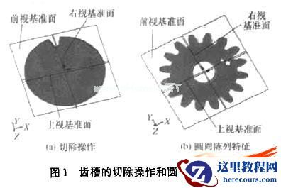齿轮参数化建模包括4个模块:系统界面设计模块、齿形计算与生成模块、轮毅生成模块、三维实体模型生成模块。系统界面设计模块是建立交互的人机界面,接受用户对圆柱齿轮具体参数(齿数、模数、压力角、轮载半径)的数据输人,采取的方式是在SolidWorks下加挂利用COM方式生成的自定义动态连接库后产生的界面接口对话框,在对话框中输人齿轮具体参数。齿形计算与生成模块是利用渐开线方程式,先计算出各个点的坐标值,在结合API函数生成一个齿形的轮廓。根据输人的轮毅半径,再通过API命令得到轮毅的二维平面图形。接着通过切除命令,得到一个齿槽,再用圆周阵列阵列特征,得到所有齿形,完成齿轮的建模。图1为齿槽的切除操作和圆周阵列特征。
