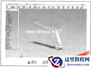 5)利用镜象工具,完成对相应特征的镜象操作,最终完成零件的造型。完成后的动臂三维图如图3所示。