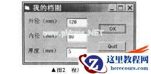 钣金首先必须在VB中引入Solidworks的对象库。具体做法是:启动VB,新建一个工程后,选择"Project(工程)-> References(引用)"菜单,在"Avaliable References"(在可使用的对象)中选择"solidworks 2001Type Library,按"确定"就可以了。然后建立"我的档圈"人机交互主控界面(如图2),其中3个文本框分别用来输人档圈外径、内径和厚度;"OK"按钮的功能是实现用VB驱动Solidworks参数化绘制档圈;"Quit"按钮的功能是退出程序,停止绘制。以下是参数化绘制档圈的关键代码及主要功能函数的注释。