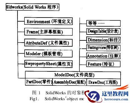 不管用VC++,VB,或者用VBA开发SolidWorks都要在调用SolidWorks对象的体系结构基础上进行.在SolidWorks的API中,其各种功能都封装在SolidWorks的对象中,和其他VB对象一样,具有自己独立的属性、方法.通过调用SolidWorks的对象的属性以及方法,可以实现各种功能.图1是SolidWorks的对象模型树.