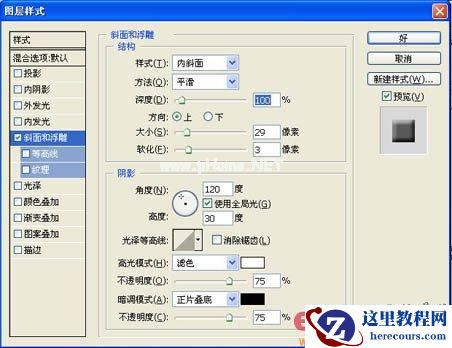 4、复制“图层1”为“图层2”,将“图层2”隐藏。按住“Ctrl”键的同时,单击“图层1”生成选区,将前景色的RGB设置为褐色,其RGB值分别为137、87、64,背景设置为白色,用前景色填充选区,取消选区,单击“图层”控制面板下方的“添加图层样式”,在弹出的菜单中选择“斜面和浮雕”命令,弹出“斜面和浮雕”对话框,在“样式”选项的下拉列表中选择“内斜面”,将“大小”选项设为29,“软化”选项设为3,其他为默认,如图04所示单击好,效果如图05所示。
