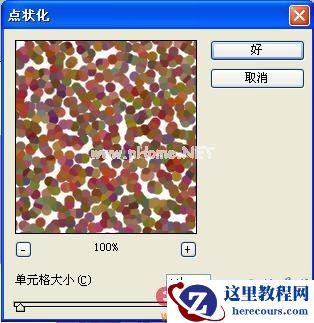 5、单击“图层2”,使“图层2”显示。选择菜单栏中的“滤镜”“像素化”“点状化”命令,在弹出的“点状化”对话框中,将“单元格”设为11,如图06,单击好,效果如图07所示。